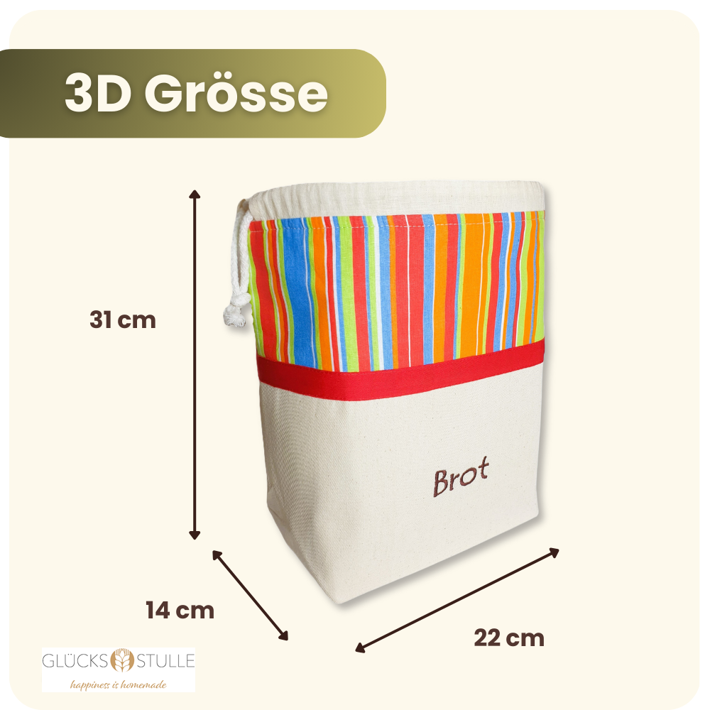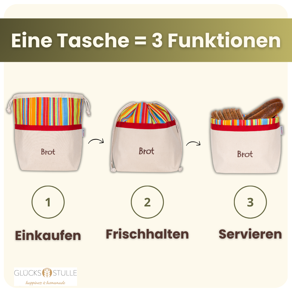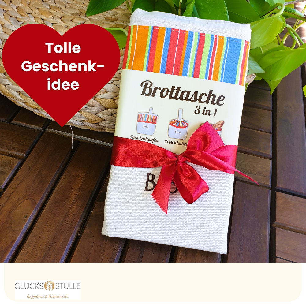 Frisch und knusprig aufbewahren und schön servieren: Verwahre Dein Glücksstullen-Brot in einer Brottasche, denn darin kann die Luft zirkulieren. Gleichzeitig absorbiert der Stoff überflüssige Feuchtigkeit und schützt Dein Glücksstullen-Brot vor Schimmel.