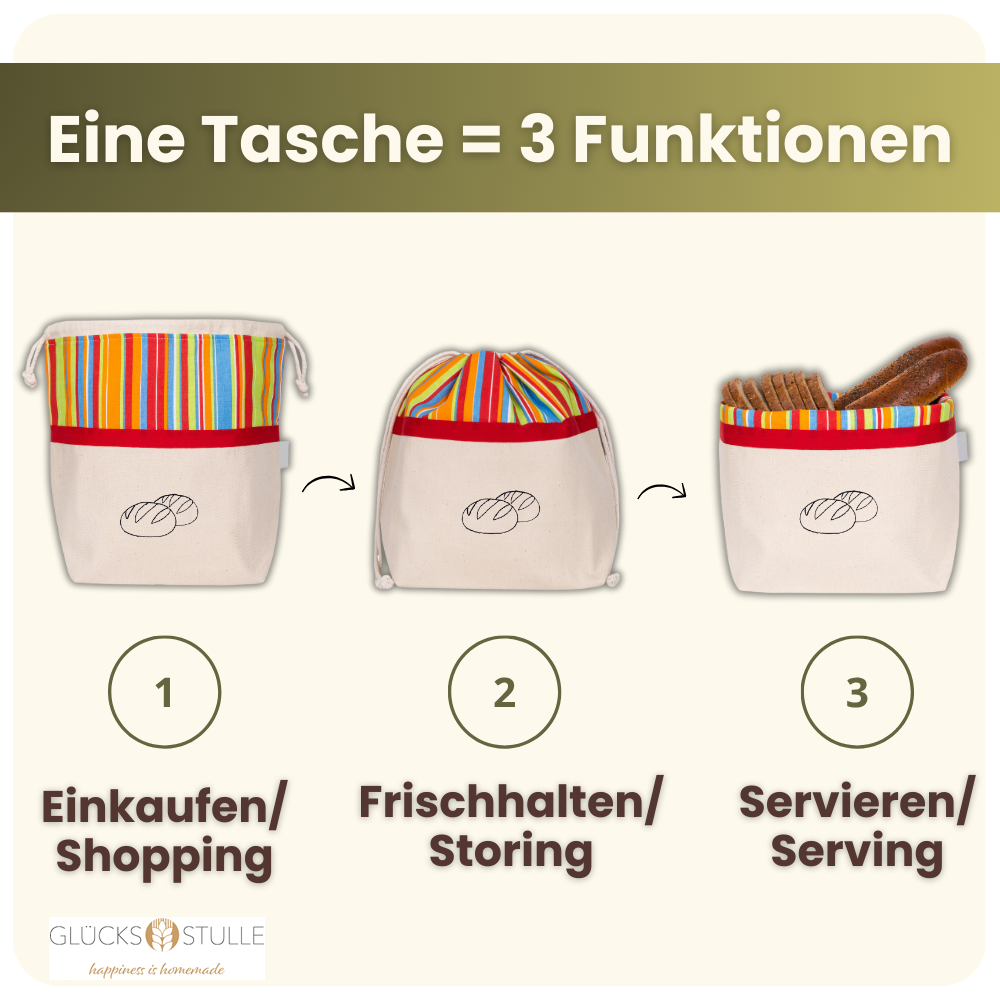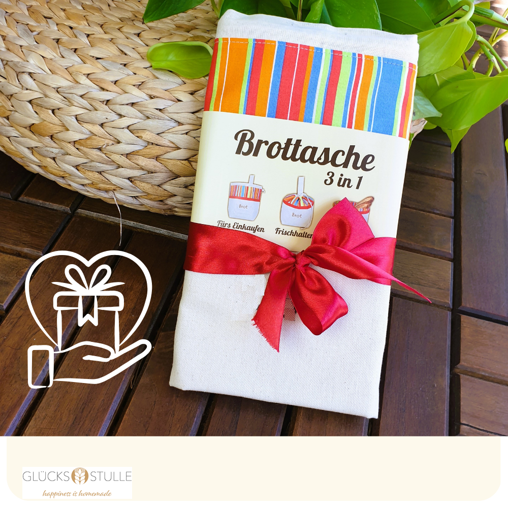 Frisch und knusprig aufbewahren und schön servieren: Verwahre Dein Glücksstullen-Brot in einer Brottasche, denn darin kann die Luft zirkulieren. Gleichzeitig absorbiert der Stoff überflüssige Feuchtigkeit und schützt Dein Glücksstullen-Brot vor Schimmel.